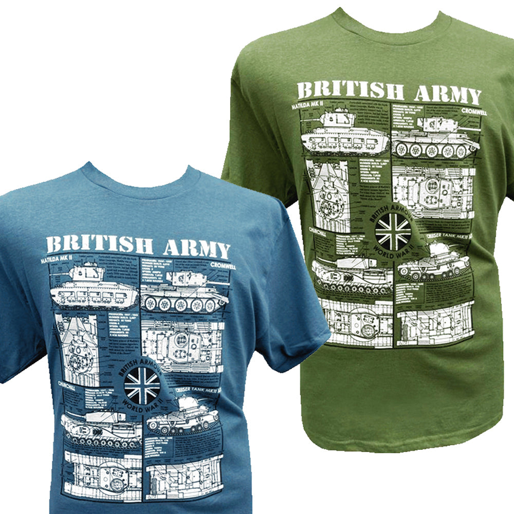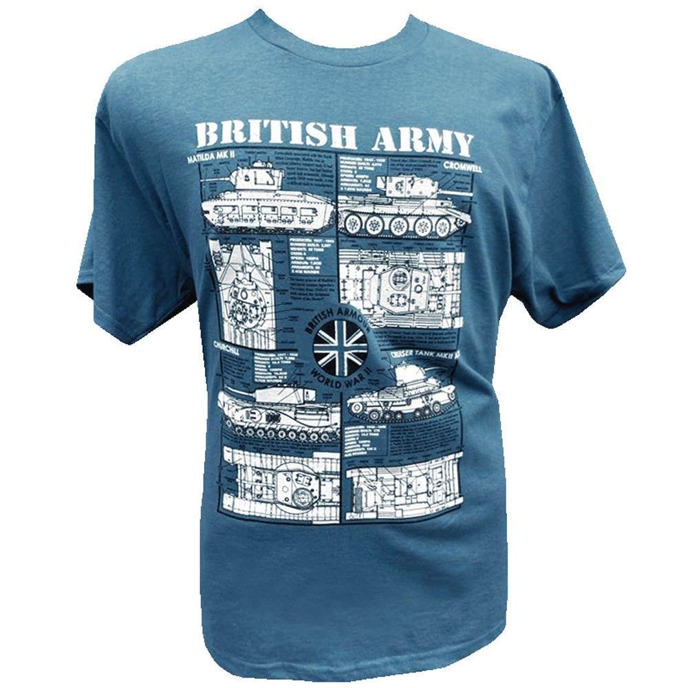Unique military themed blueprint design features The Matilda MkII, Cromwell, Churchill and the Cruiser Tank t-shirt.
