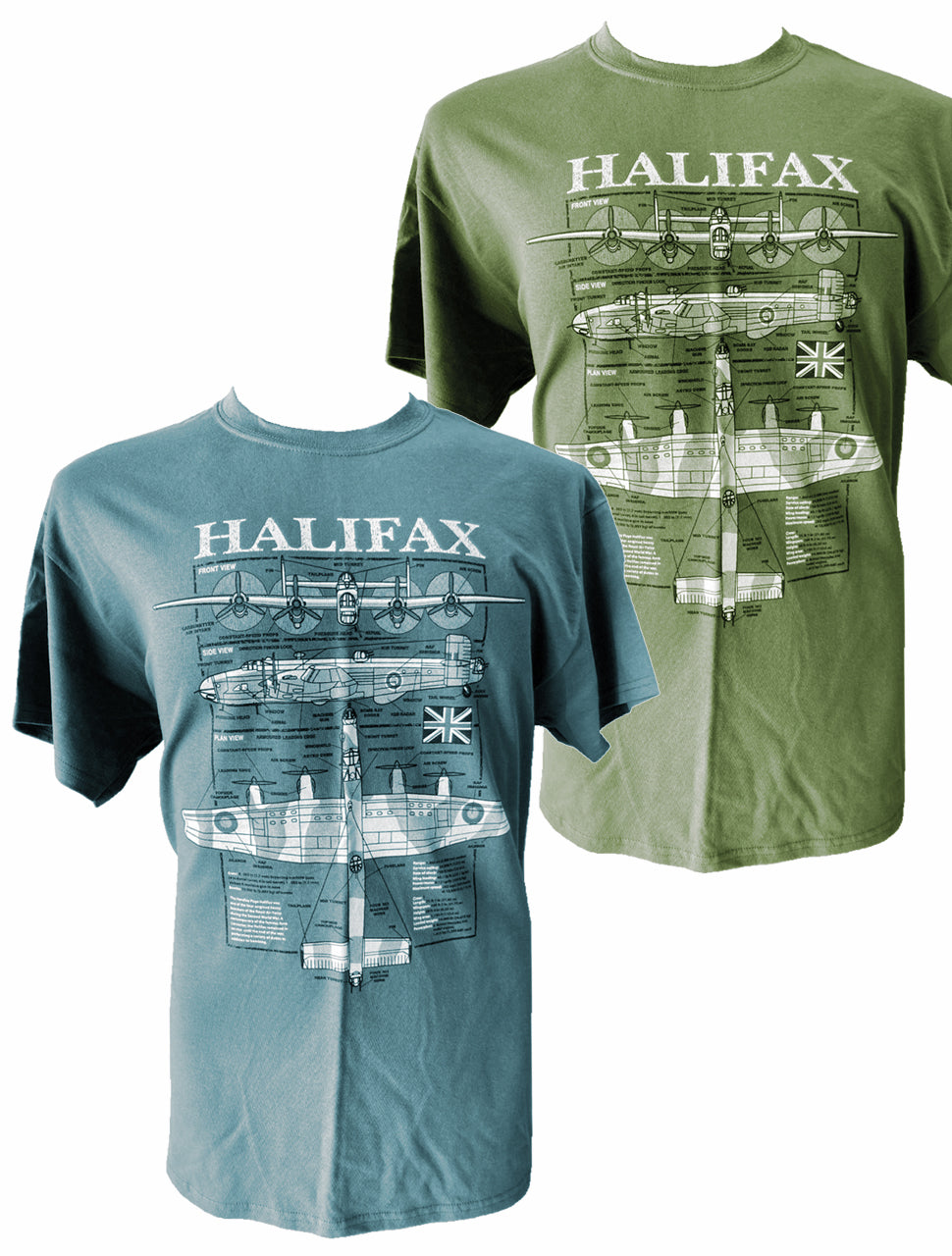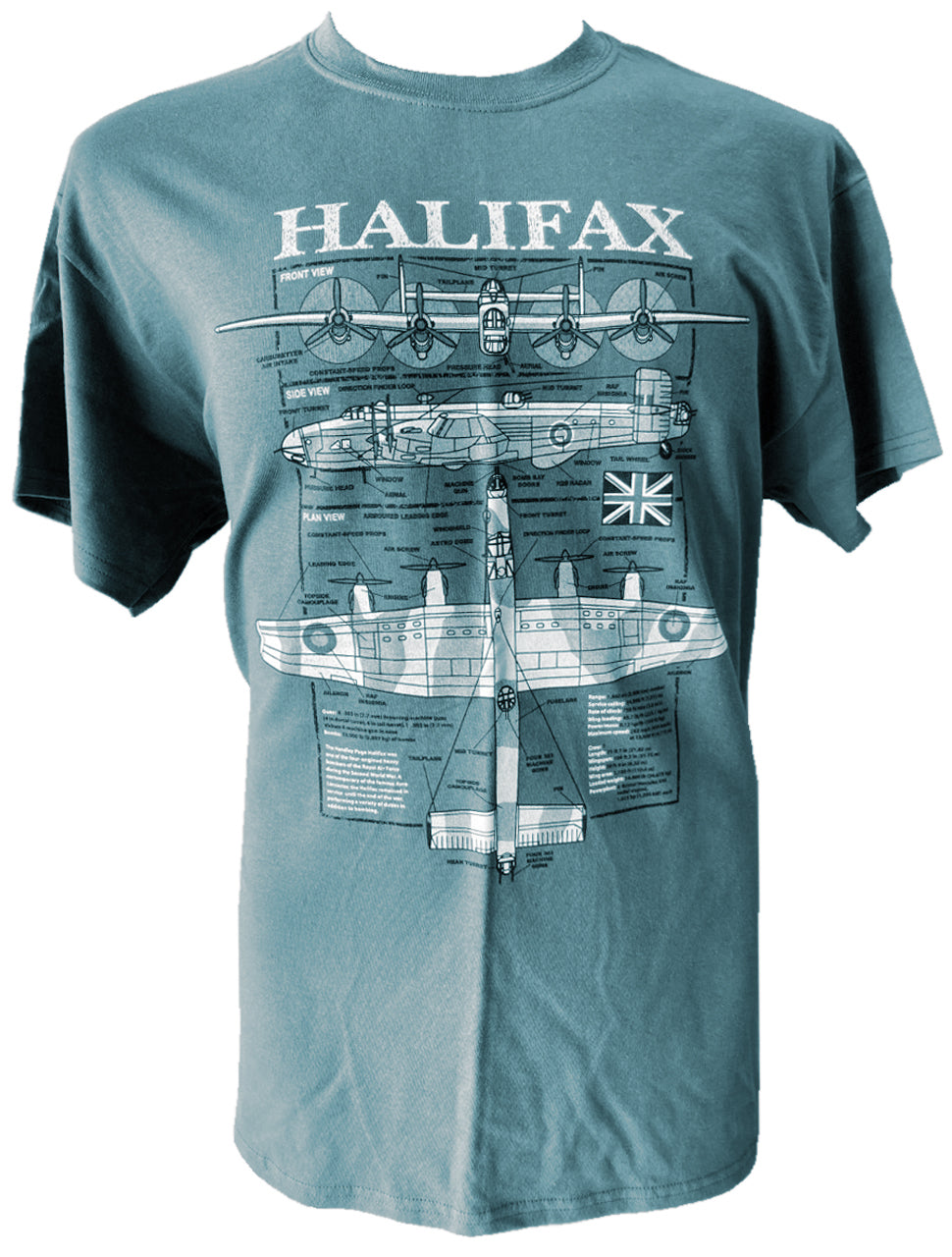 Unique military themed blueprint design Handley Page Halifax WWll RAF, RCAF, RAAF, FAFL Four Engine Heavy Bomber Aircraft T-shirt.